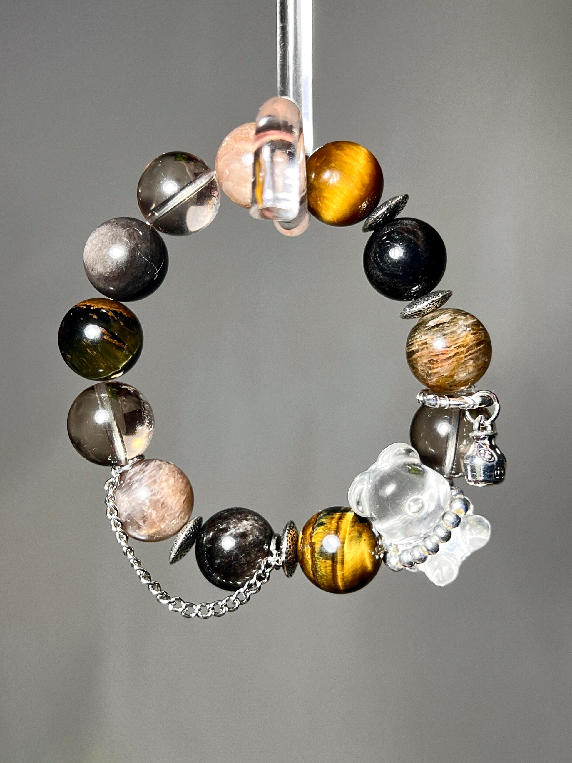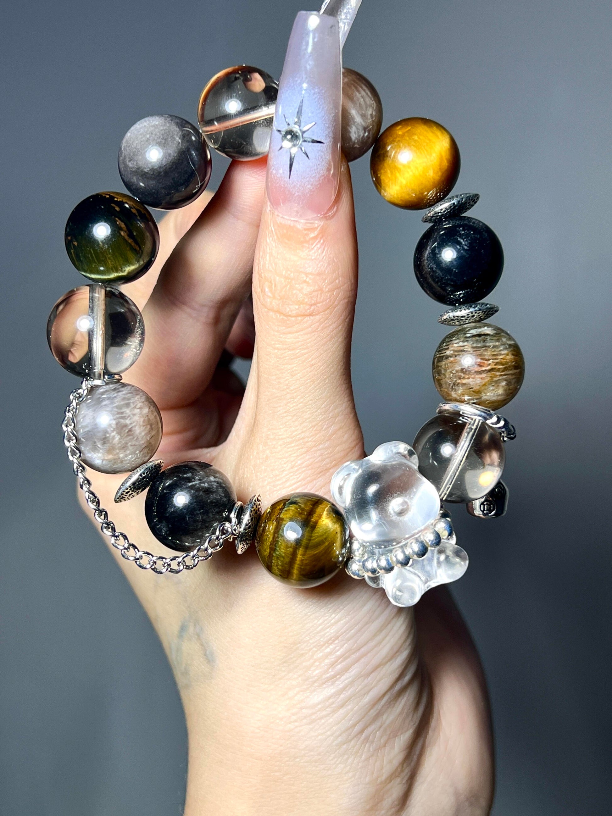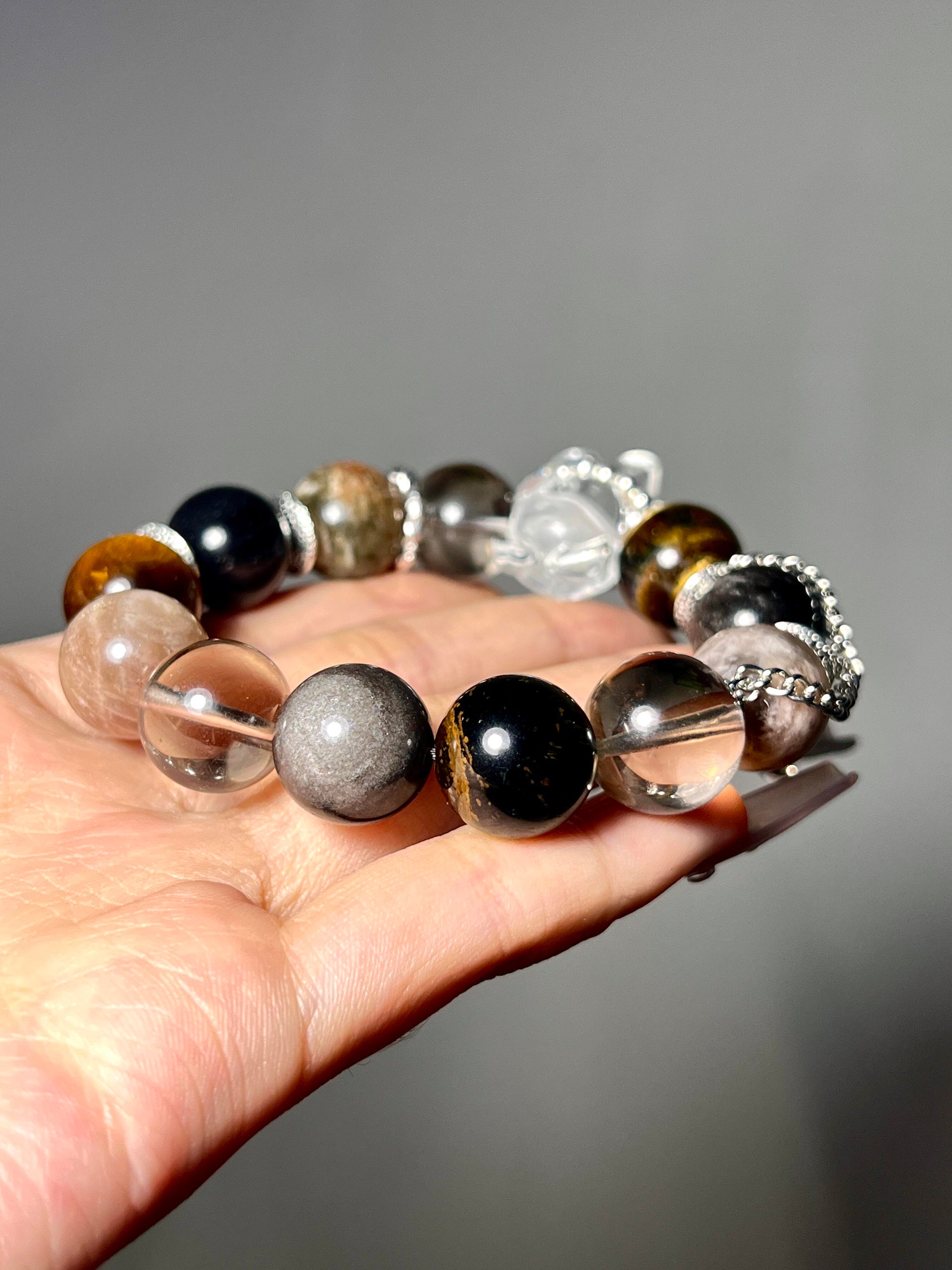 22mm Clear Quartz Bear | 14mm Silver Sheen Obsidian |