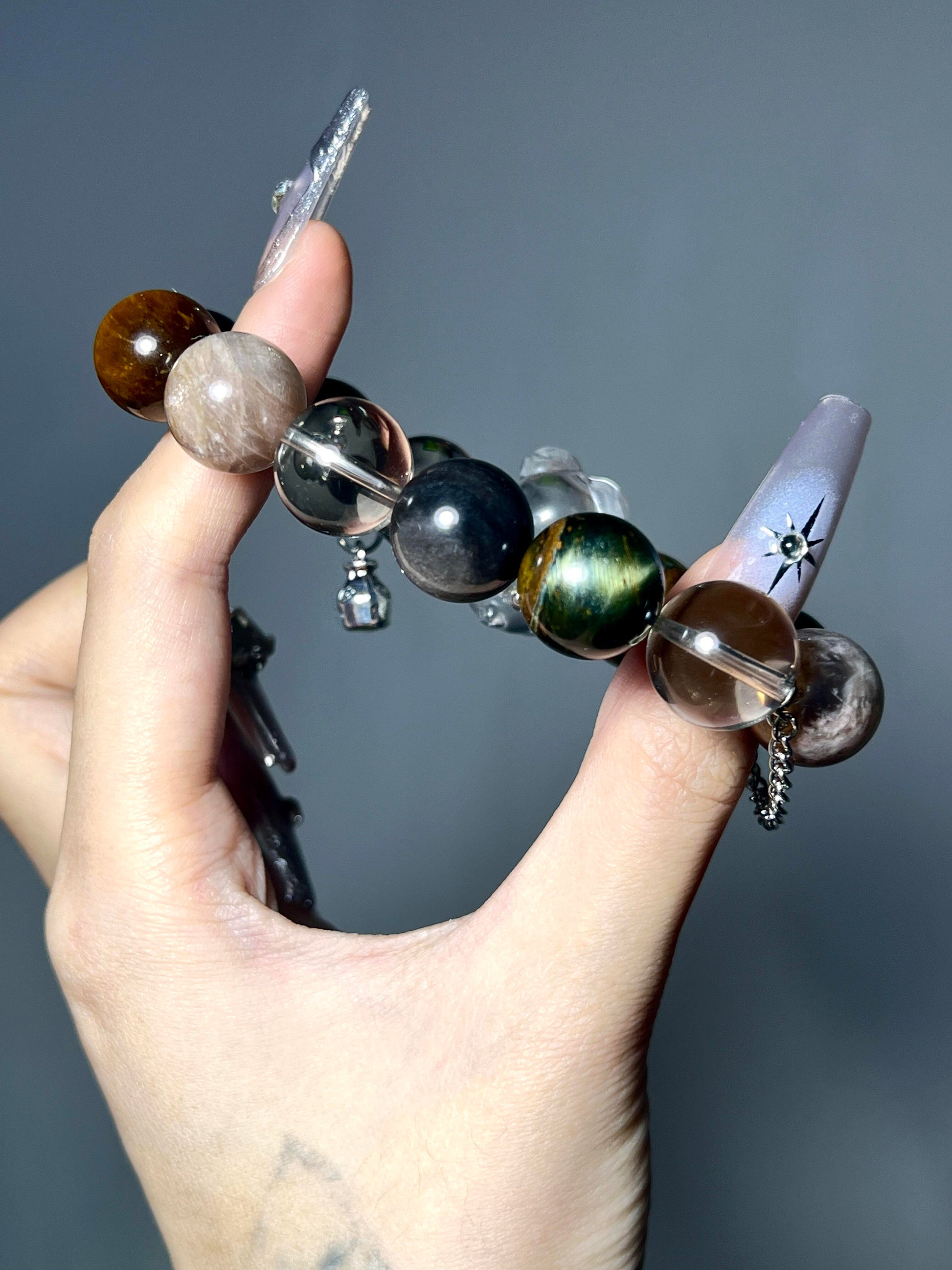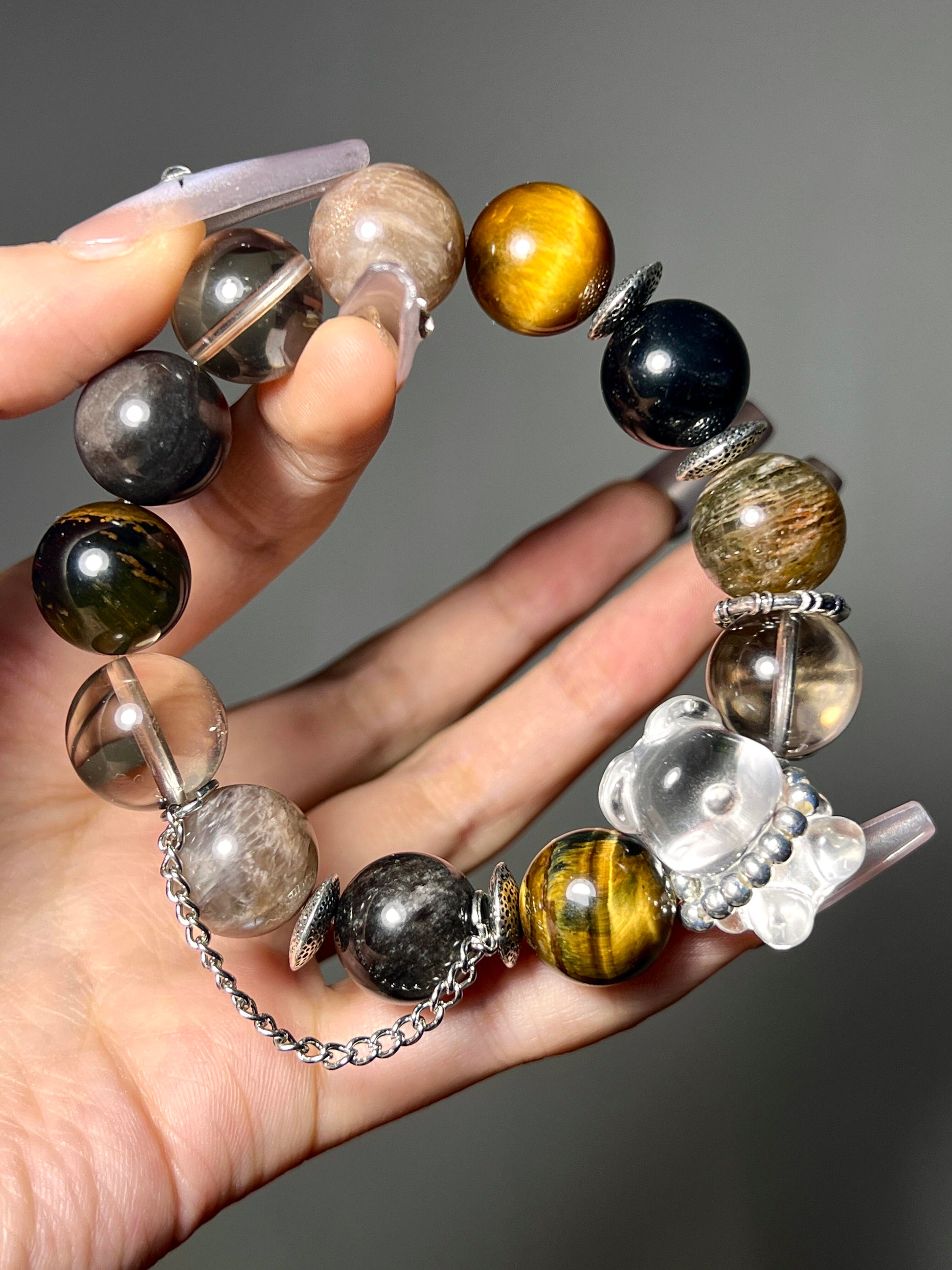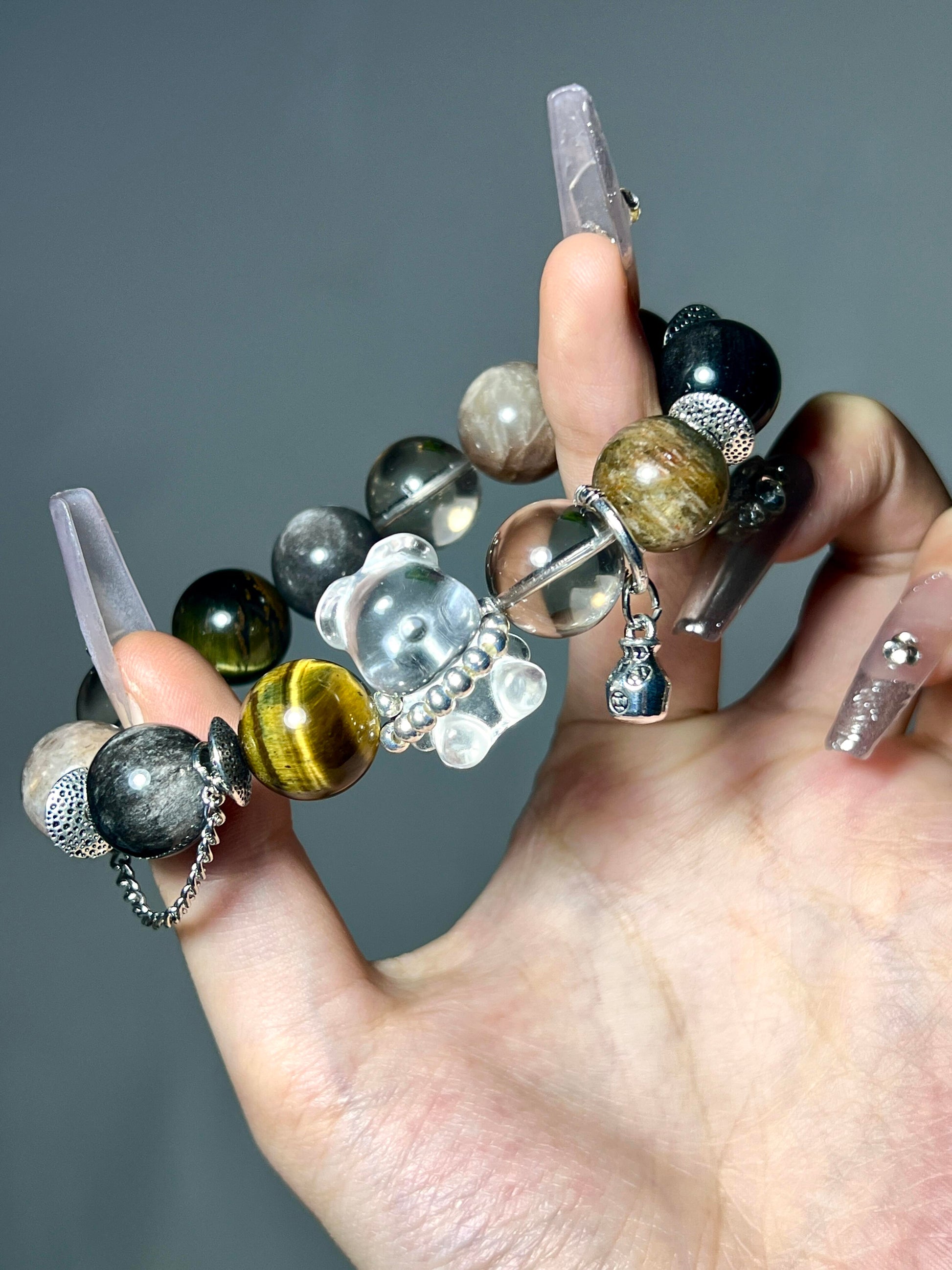 22mm Clear Quartz Bear | 14mm Silver Sheen Obsidian |